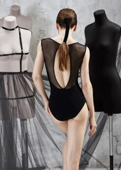 Classic pinch front tank leotard that turns to reveal a dramatic zip back of hand-cut lace.