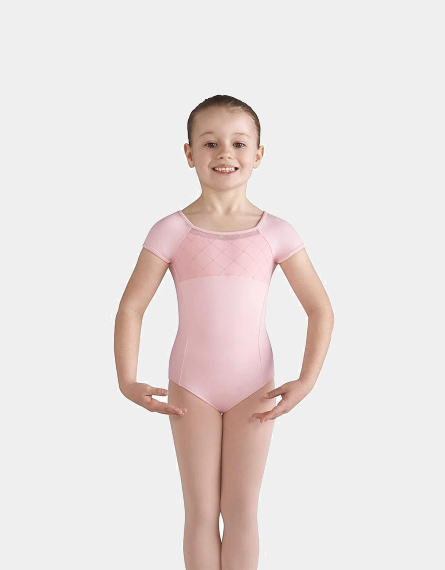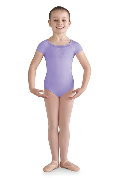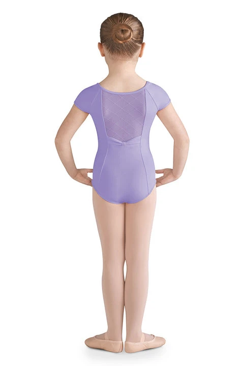 This sweet cap sleeve leotard features a diamond heart flocked mesh front bodice and back panel. Princess seams decorate the front and back for a classic ballet style. A cute bow sits at the base of the mesh back panel.