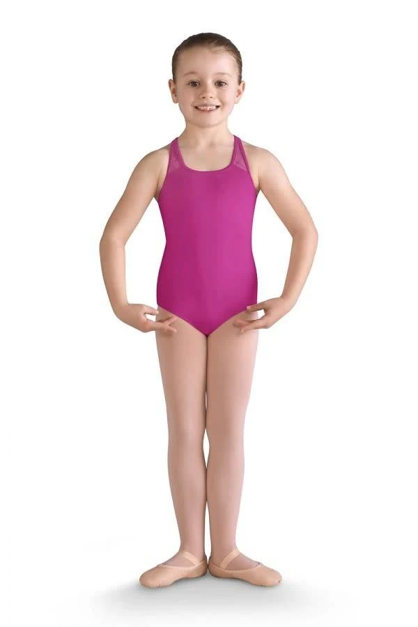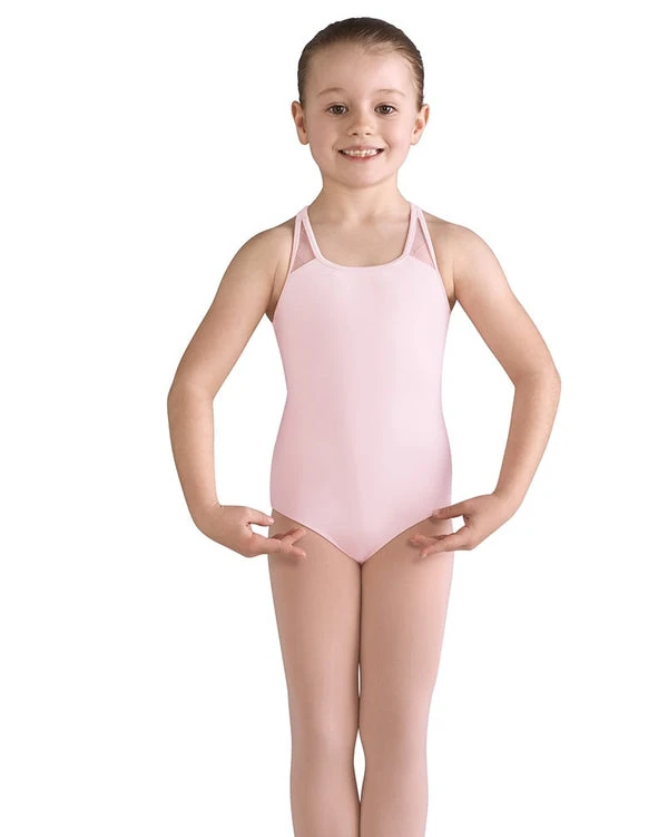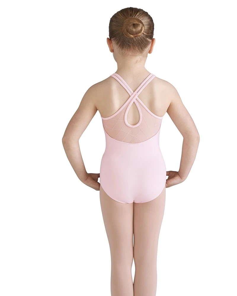 She’ll be a tiny trendsetter in the Bai Diamond Heart Flocked Cross Back Tank Leotard by Bloch.