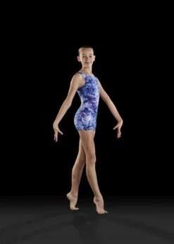 This biketard is a tank style that is classic and comfortable. The piece features a bold print with metallic accents that will catch everyone’s attention. Also, the longer leg line is great for gymnasts who would like more coverage.