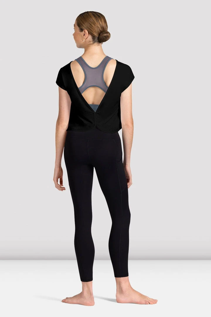 Ladies Kiera V Back Top features a flattering boat neck and short sleeves with a deep V back. Pair with Ladies Enya 7/8 Leggings for your perfect dancewear ensemble. Part of Bloch Fleurs Collection; featuring beautifully embroidered floral motifs that adorn each elegant design, crafted from our signature performance fabric, adding a touch of natural beauty to your dance wardrobe.