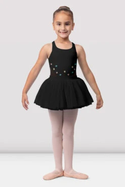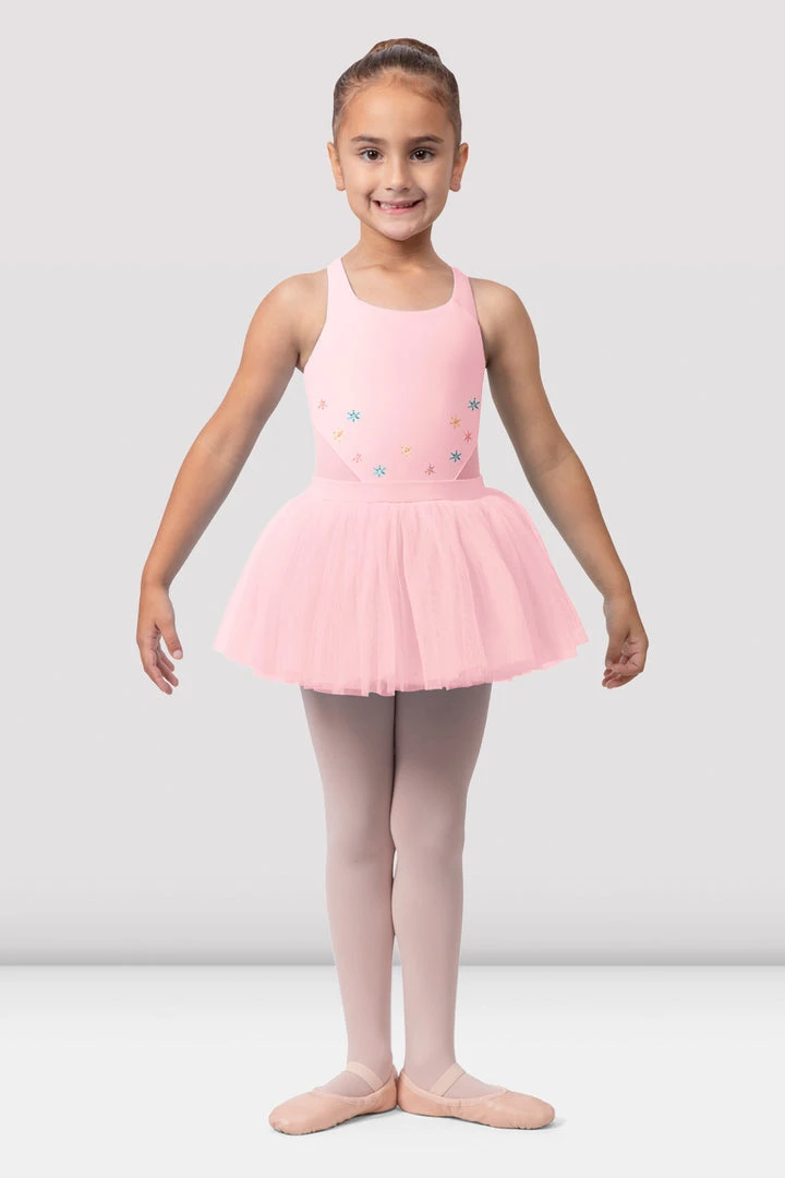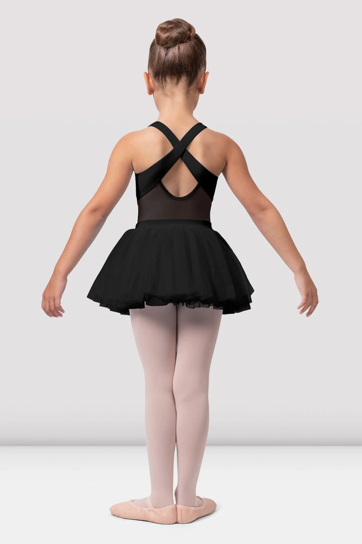 Isabeau Cross Back Tutu features scoop neck, tank design with crossing back straps and mesh panels. Beautifully finished with a tulle tutu and embroidered flower design.Â