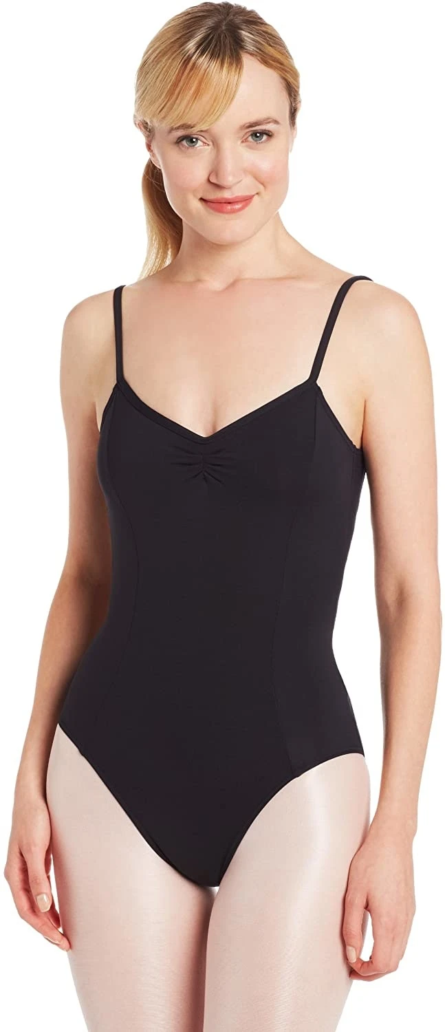 Princess-seamed camisole leotard featuring flattering dual pinch v-front and back necklines.