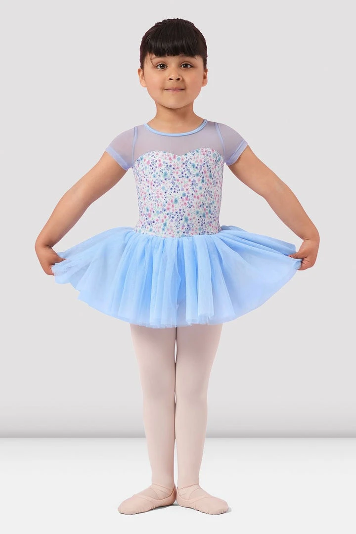Mirella Ditsy Floral Cap Sleeve Tutu Dress features a scoop neck with mesh cap sleeves and an attached tulle tutu. Part of the Girls Mirella Ditsy Floral Collection with charming designs including delicate floral prints, soft mesh panels in a trio of enchanting pastel tones.