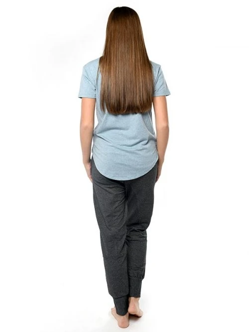 A tri blend tee featuring a soft touch graphic, round neckline, scoop hemline, and side slits.